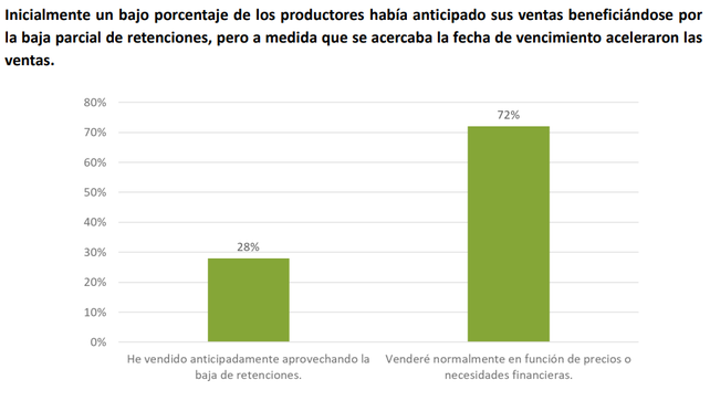 Otro aspecto relevante de la encuesta fue el análisis de la reacción de los productores frente a la baja temporal de las retenciones, que vencía el 30 de junio. Al comienzo de la medida, solo un 28% de los productores había realizado ventas anticipadas. La mayoría -un 68%- decidió esperar y seguir la evolución del mercado y las condiciones financieras.