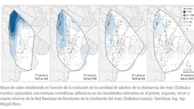 En el cuarto informe de la Red Nacional de Trampas de Monitoreo de la chicharrita del maíz (Dalbulus maidis) se relevaron 426 localidades argentinas distribuidas en las regiones del NOA, NEA, Litoral, Centro-Norte y Centro-Sur. También se monitorearon localidades de Uruguay. Del 4 al 18 de septiembre se registró una disminución de los valores de captura de adultos de D. maidis con trampas cromáticas adhesivas en la mayoría de las localidades relevadas, fenómeno que se observó con una magnitud mayor en las regiones del NOA y NEA.