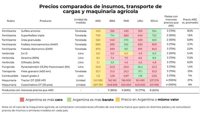 Las excepciones que se encontraron fueron: transporte de cargas (flete granario por camión de 400 kilómetros), donde Argentina resulta un 23% en promedio más cara que el resto de los países, con una tarifa de u$s 35,7 por tonelada kilometro (un nivel muy similar, levemente inferior al de Uruguay u$s 37,1 tonelada kilometro); y maquinaria agrícola, particularmente en tractores, donde Argentina se ubica 27% más cara que el promedio de los otros países, y en menor medida en cosechadoras, donde la brecha no llega al 10%.