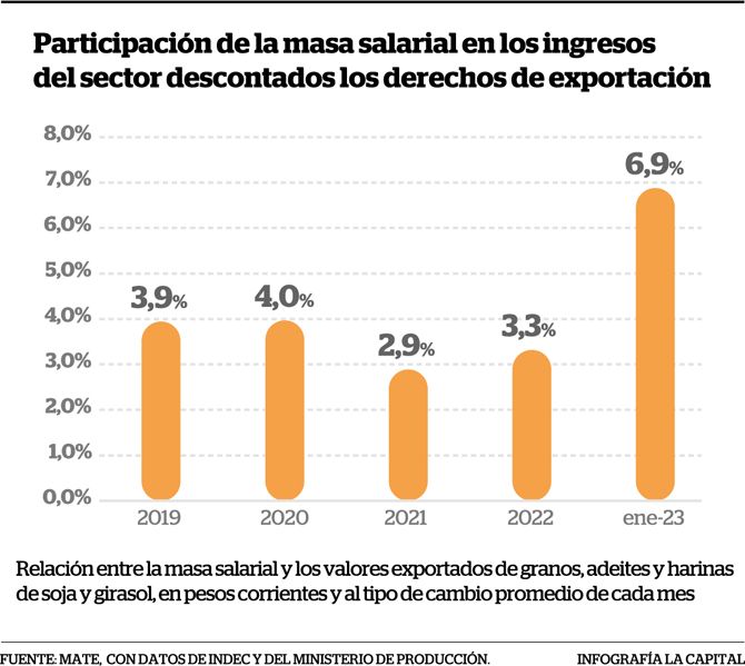 En 2022 creció tanto el nivel de ingresos por exportaciones como la masa salarial pero los salarios lo hicieron en una mayor proporción, por lo que la participación de la masa salarial se incrementó de 2,9% a 3,3%. En enero de este año la merma en los valores exportados junto y la actualización salarial que tuvo el sector produjo que se duplicara esa participación, ascendiendo a 6,9%.