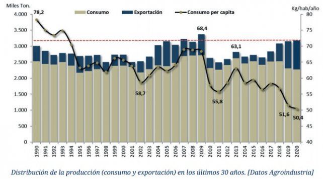 Es así como el mercado doméstico transitó períodos en los cuales ha llegado a absorber más del 90% del total producido, en momentos en los cuales la exportación era explícitamente desalentada. Tal es el caso de los años 2012 a 2015 donde tras una política netamente combativa del mercado externo, con cupos a la exportación, retenciones, etc., el consumo per cápita promedió niveles de 60kg., muy superiores, incluso, al de los principales consumidores de carne vacuna en el mundo.