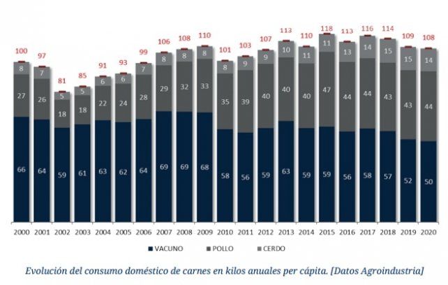 En 2020, año claramente signado por la pandemia, el consumo de carne vacuna por habitante cerró en una media de 50,4 kilos anual, el nivel más bajo de las últimas décadas. Sin embargo, el consumo total de carnes en Argentina prácticamente no ha sufrido variaciones en los últimos años, sí lo hizo su composición.