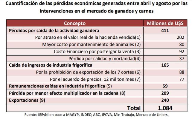 El análisis de la SRA concluye que, en 135 días de estas políticas, la cadena de ganados y carnes acumuló pérdidas por 1.084 millones de dólares, cifra que representa más de 8 millones por día de intervención.