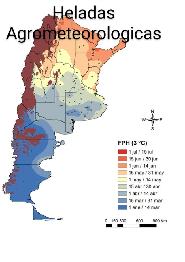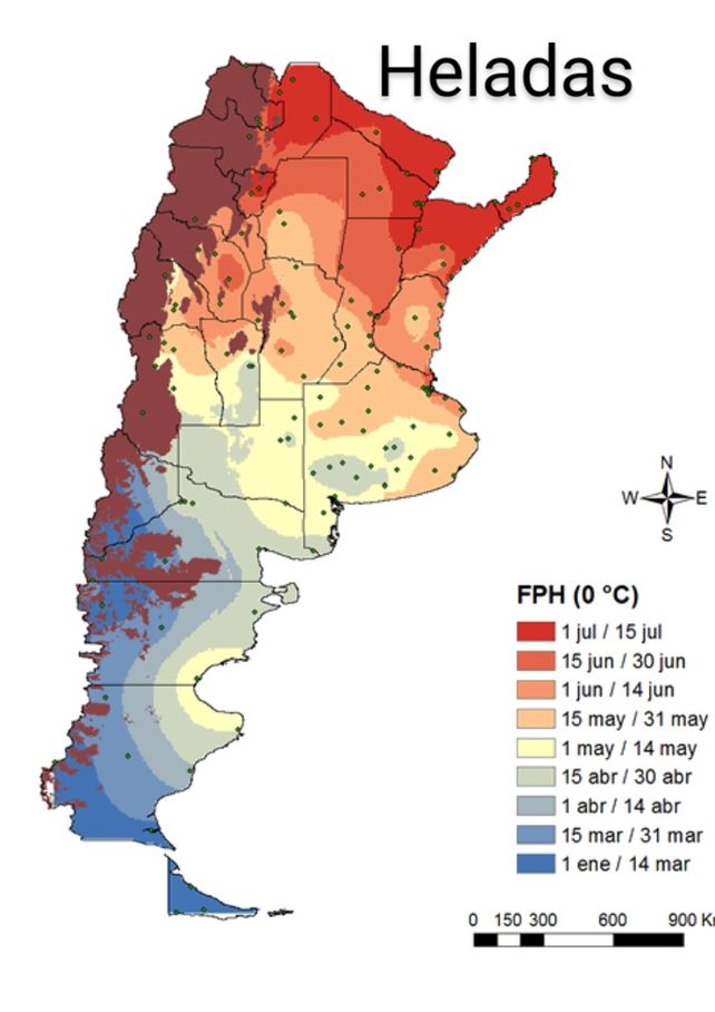 Este es el mapa de fechas de las primeras heladas meteorológicas y desde el 15 de abril son más frecuentes. Se considera a las mismas cuando las temperatura son inferiores a los 3° y comienzan a afectar a los cultivos.