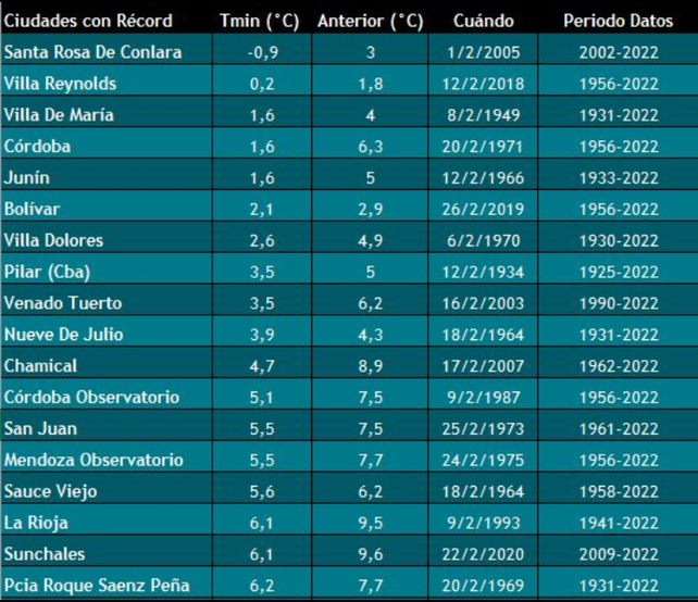 El extraordinario descenso de la temperatura dejó también algunos registros récords de mínimas en la región para febrero. Aquí algunos valores marcando la situación atípica: