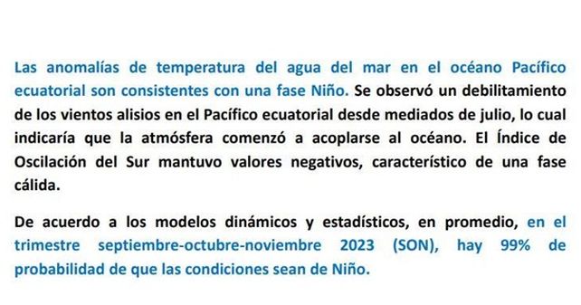 El Niño ya es una realidad. El Servicio Meteorológico Nacional ha oficializado que debido a las condiciones actuales de las aguas de Pacifico Ecuatorial entramos en etapa Niño, con el correr de los meses se prevén para la región núcleo temperaturas más altas y precipitaciones más frecuente, con un pico notorio al final de la primavera y comienzo del verano.