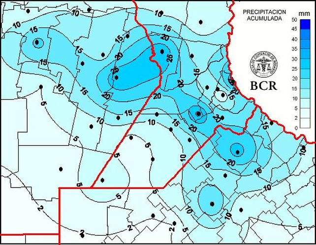 Mientras en Rosario y alrededores las lluvias se dieron de manera mucho más tranquila, las zonas más afectadas por granizo y viento fueron el centro y norte de la provincia de Buenos Aires, especialmente los alrededores de Saladillo. De acuerdo a los datos relevados por la red de estaciones meteorológicas de GEA-BCR, los registros más altos se ubicaron en Bigand (32 mm), Monte Buey (30 mm), Montes de Oca (30 mm), Rosario (30 mm) y Pergamino (28 mm).