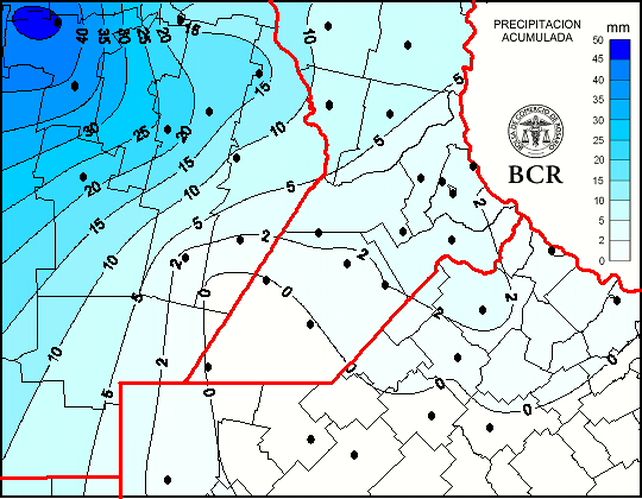 Cristian Russo, jefe de Estimaciones Agrícolas de la BCR, indicó que el mapa de lluvias confirma que las mayores chances de lluvias se concentraron en el centro-norte de Córdoba, mientras que el sur de Santa Fe quedó prácticamente sin agua significativa.