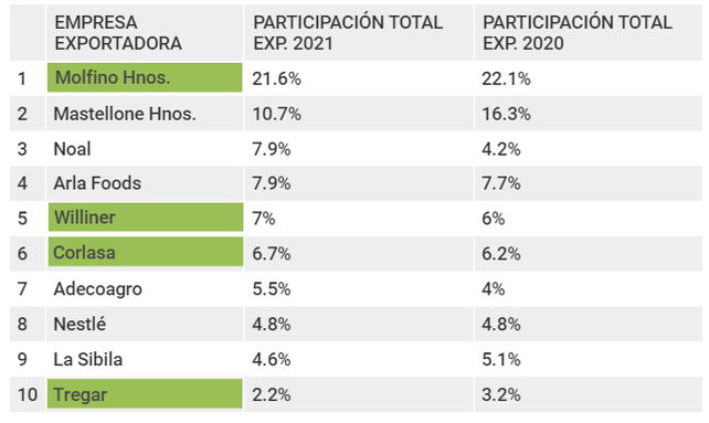 Precisamente la industria láctea número del país, con planta central en General Rodríguez (Buenos Aires), es la que se encuentra en segundo lugar de este ranking exportador, con el 10,7% del total, un puesto que mantiene respecto a 2020.