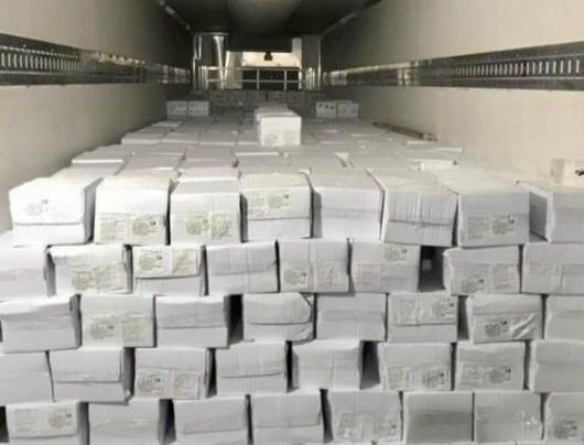 El cargamento está compuesto por 1231 cajas de cola de langostino congelado, 14 de langostino entero congelado y 84 de langostino pelado devenado con un peso neto total de 23.306 kilogramos.