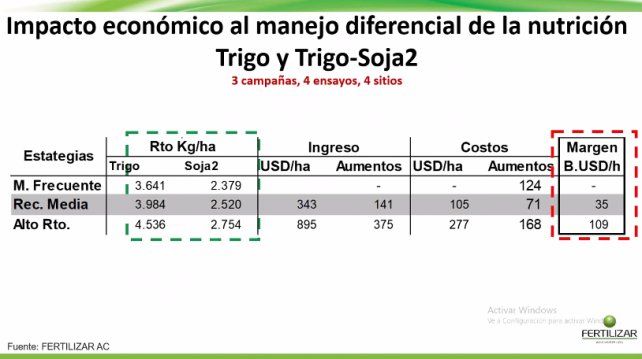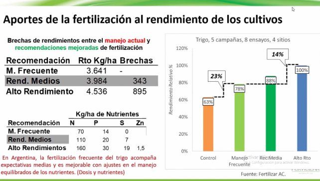 "El 23% de la cosecha de trigo tiene en su génesis el aporte de fertilizantes y todavía hay un 14% de rendimiento que nos estamos perdiendo", apuntó Bassi, en relación a las brechas de rendimiento entre el manejo actual y las recomendaciones mejoradas de fertilización. "La mayor producción de trigo es acompañada por mayores rendimientos de soja de segunda, con aumentos del 14% de rendimiento", agregó.
