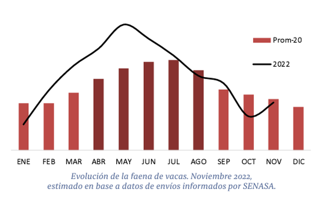 En consecuencia, sigue saliendo mucha hacienda de los campos. Durante noviembre, 1.192.410 animales fueron enviados a faena, esto es un 6% más que lo remitido el mes previo y un 7% más que lo enviado en noviembre del año pasado. A este dato, se suman los animales que, aun trabajando a pérdida, siguen encerrando los feedlots para su terminación a grano. Si bien aún no se dispone de la estadística de ingresos efectivos a los establecimientos de engorde, durante el último mes, el dato elocuente es la cantidad de animales declarados en stock al 1ro. de diciembre. Según datos informados SENASA, este número asciende a 1.640.645 animales, apenas un 4,5% menos que lo registrado el mes previo, es decir, una carga aun demasiado elevada para la época del año y la gravosa situación que enfrenta el feedlot.