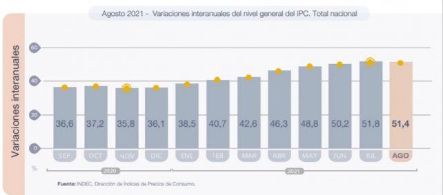 El nivel general del índice de precios al consumidor (IPC) representativo del total de hogares del país registró en agosto una variación del 2,5% con relación al mes anterior, del 32,3% en el período enero-agosto 2021 y del 51,4% en el interanual. A pesar de ser cifras exorbitantes, es la primera vez en un año que la inflación mensual comienza a descender al igual que el acumulado interanual.