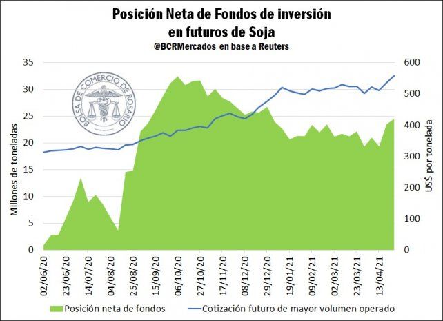 Con cerca de 24,5 Mt, la semana pasada totalizó la mayor cantidad de contratos netos compradores en todo el año, dando soporte a la tendencia alcista de los precios. En efecto, el contrato más cercano de soja cerró abril en el mercado de referencia con la tonelada cotizando a US$ 578.