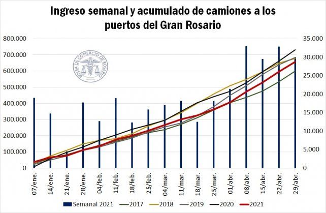 La menor disponibilidad de granos en el mercado local para esta altura del año se ve reflejado en el ingreso de camiones a los puertos del Gran Rosario. En base a datos de recibidores, se estima que desde enero a la fecha arribaron un total de 667.000 camiones a descargar granos (incluyendo soja, maíz, trigo, sorgo, girasol y cebada), un 14% menos que lo ocurrido a igual fecha del año anterior, y el menor número de camiones desde el año 2017.
