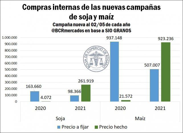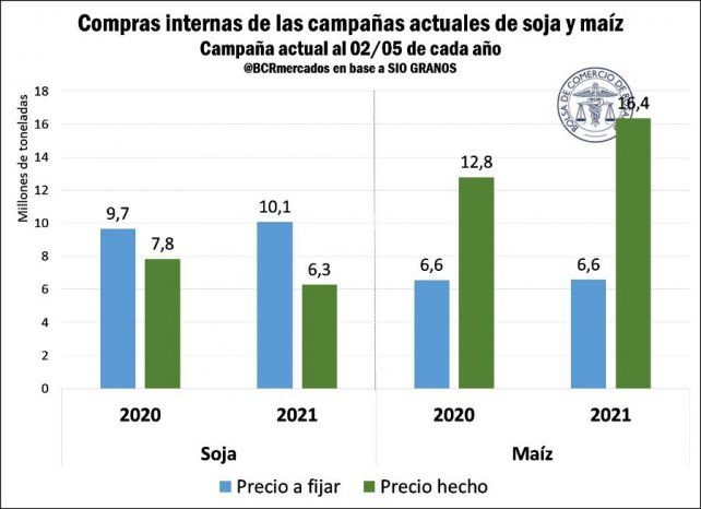 En lo que respecta al maíz, el informe del Departamento de Estudios Económicos de la BCR señala que hay un repunte en las compras de industriales y exportadores. A principios de abril, estos negocios acumulan 22,9 millones de toneladas, cuando en el año anterior se registraron 19,3 millones de toneladas, en tanto que la proporción de compras con precio cerrado pasó del 66,1% en 2020 al 71,3% en 2021.