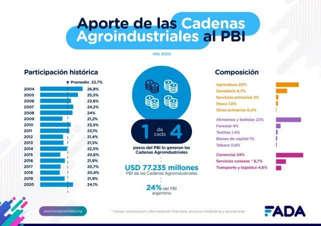 “Las cadenas agro generan 1 de cada 4 pesos que produce el país. El 24% del PBI argentino proviene del campo, son USD 77.235 millones, es la actividad que mayor aporte genera. Le siguen en importancia: el comercio mayorista y minorista de otros productos (12%), como ropa, calzado, electrodomésticos, la actividad inmobiliaria (11%), salud y educación (11%) y la industria manufacturera de productos como autos, prendas de vestir, maquinarias, etc. (10%)”, agregó David Miazzo, economista Jefe de FADA.