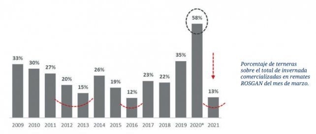 Una de ellas es la menor oferta de terneras que se está viendo en este inicio de zafra. Si analizamos la participación de terneras sobre el total de lotes de terneros/as de invernada ingresados en los diferentes remates del mes de marzo de Rosgan, surge un indicador sumamente elocuente. El 2020 se descarta del análisis por tratarse de un remate ocurrido durante los primeros días de abril y en un contexto donde seguramente se mezclen diferentes factores que pueden sesgar la interpretación. Sin embargo, comparando con los ciclos previos, la participación de terneras sobre el total de invernada (terneros, terneras y lotes mixtos) subastados en los dos remates del mes de marzo alcanza un escaso 13%, en total consistencia con los porcentajes registrados en períodos asociados a fases de retención.